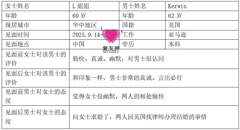 今年5月,L姐姐遇見了62歲的英國紳士Kerwin。他在亞馬遜工作,是個典型的英倫紳士,雖然忙碌但依然認真回覆L姐姐的信息,細心瞭解她的興趣,言語中處處體現着對女性的尊重。L姐姐也很用心,每天主動和情感老師Elva覆盤聊天情況,但交流始終不温不火的。