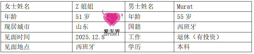 2025年12月8日,當55歲的Murat走進咖啡館時,Z姐姐看到的是一位與照片上同樣清爽帥氣的男士:整齊的髮型、得體的休閒裝、温暖的笑容,讓她眼前一亮!