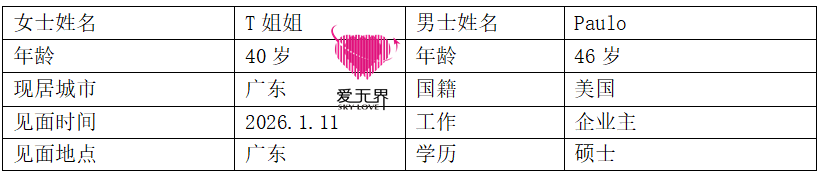廣東的T姐姐,40歲。美國的Paulo,46歲,碩士學歷,曾在加州理工大學任教,如今經營自己的公司。兩人在網上交流時十分投緣,Paulo專程飛來她的城市,只為見她一面!