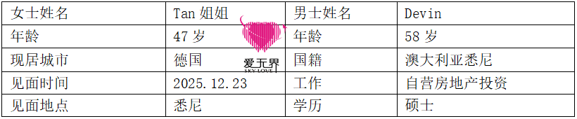 47歲的Tan從德國飛往悉尼前,就已與58歲的房地產投資者Devin建立了深厚的線上默契!